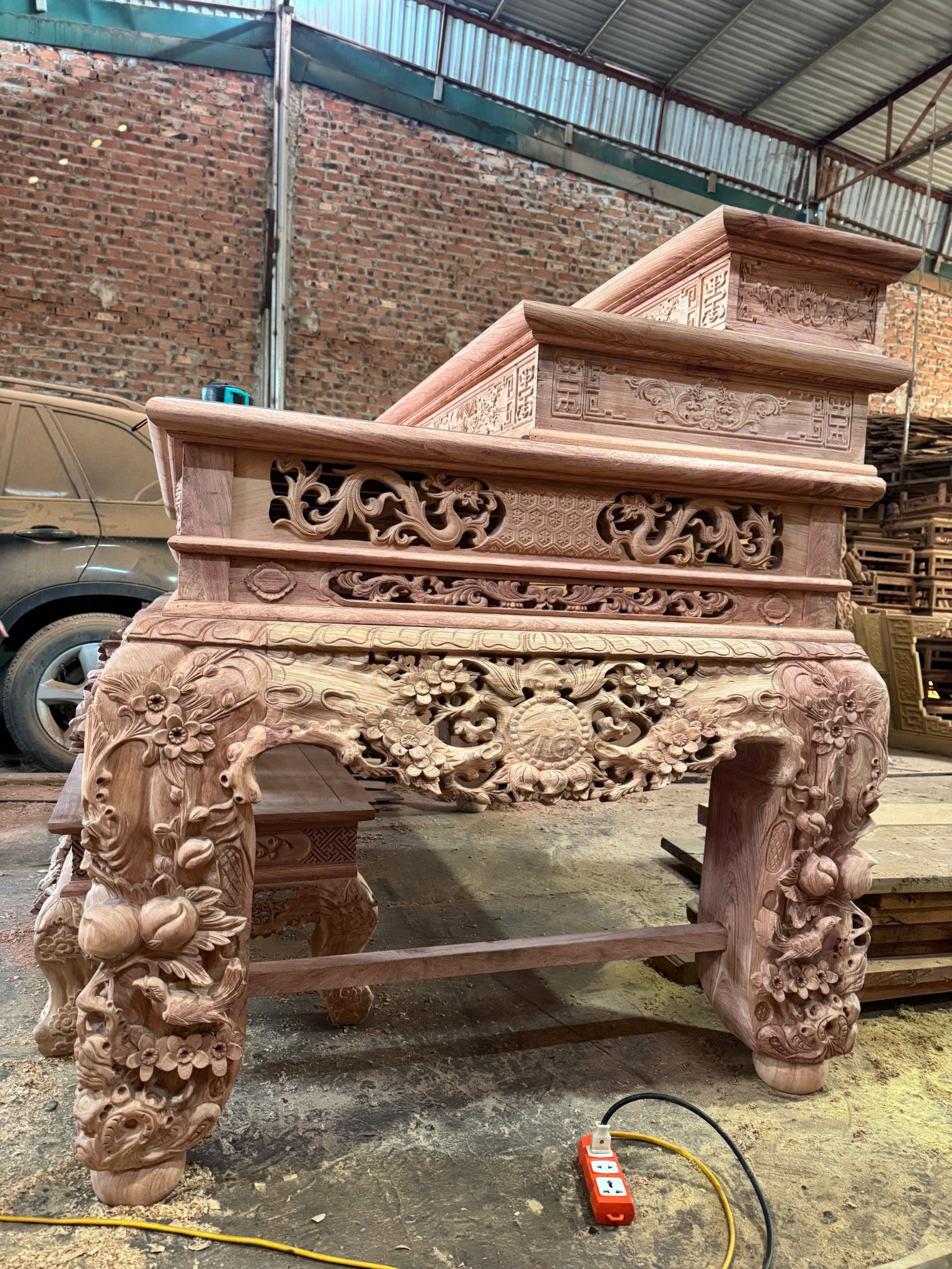 | Quy cách | - Bàn thờ đục chạm tứ linh, họa tiết kênh bong sang trọng, nâng tầm đẳng cấp không gian phòng thờ. - Bàn thờ ngang 197cm, cao 147 ( cấp cao nhất), Sâu 127cm, chân 24, mỗi cấp lùi 20 cm. - Đục chạm bởi những nghệ nhân lâu năm của làng nghề. |