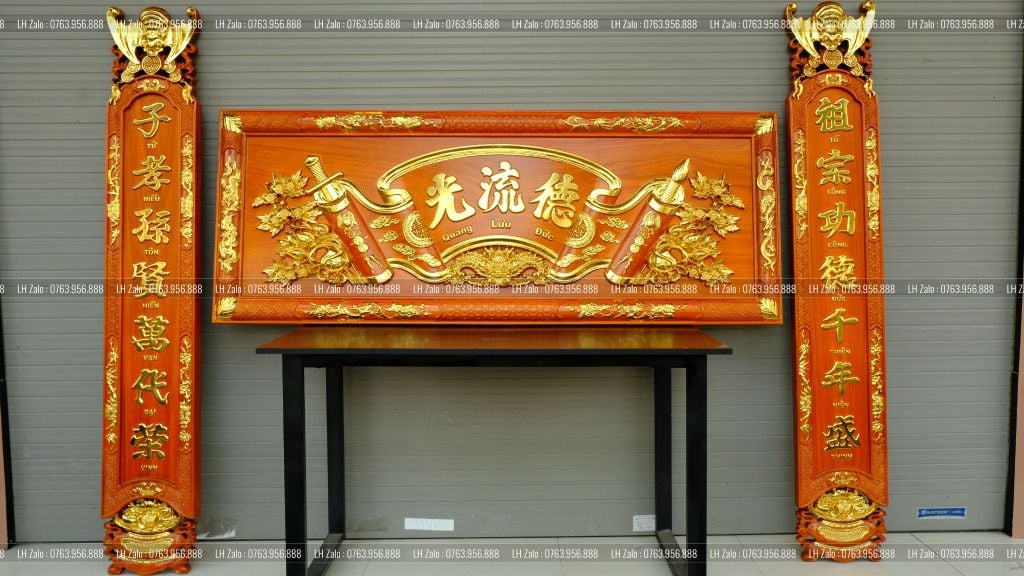 Hoành phi câu đối gỗ, liễn thờ là vật phẩm trang trí cho gian thờ thêm phần sang trọng và linh thiêng. Nhìn vào bộ hoành phi gỗ với mẫu mã, hoa văn tỉ mỉ, tinh tế ta thấy được vẻ đẹp hoài cổ như gian thờ thời xưa của ông cha ta. Bộ hoành phi câu đối bằng gỗ thể hiện được gia phong của gia đình, dòng tộc, mang chuẩn mực, lối sống của người Việt ta.