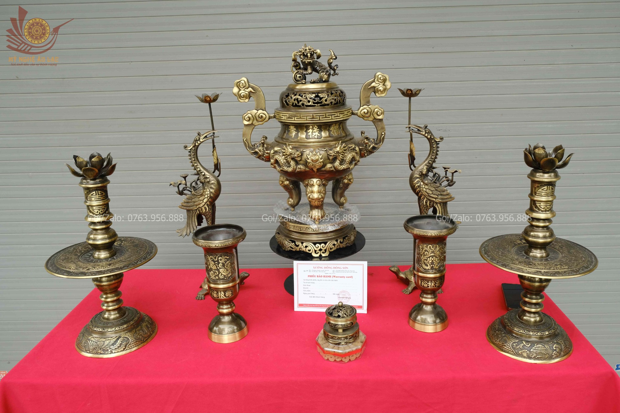 | Kích thước | - Đỉnh cao 60cm - Hạc cao 60cm - Nến cao 45cm - Sen nến 5cm - Ống hương cao 29cm |