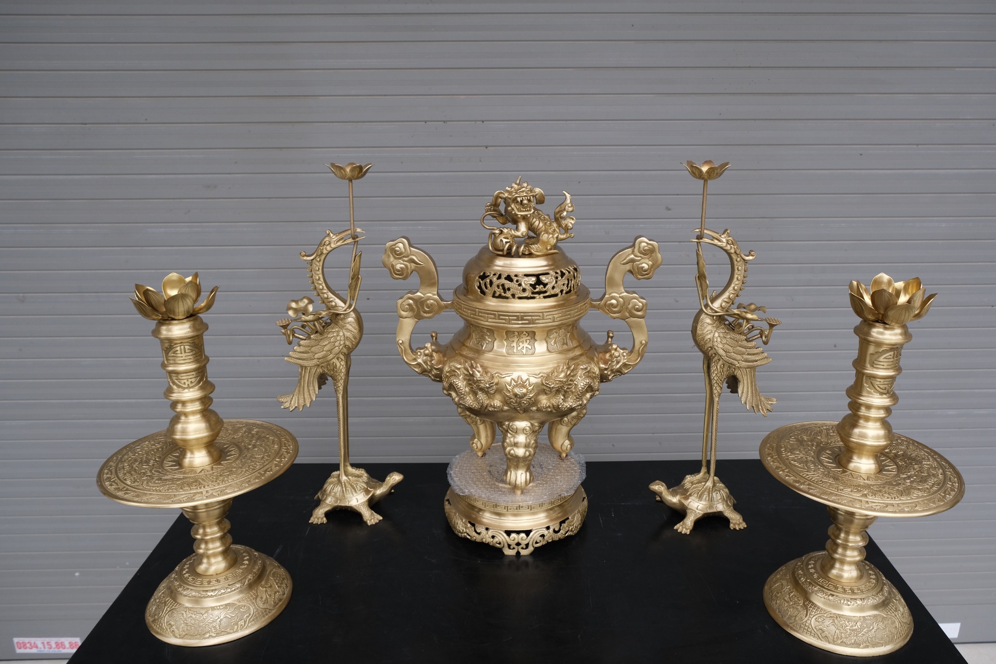 | Kích thước | - Đỉnh cao 60cm - Hạc cao 60cm - Nến cao 45cm - Sen nến 5cm - Mâm bồng đường kính 30cm |
