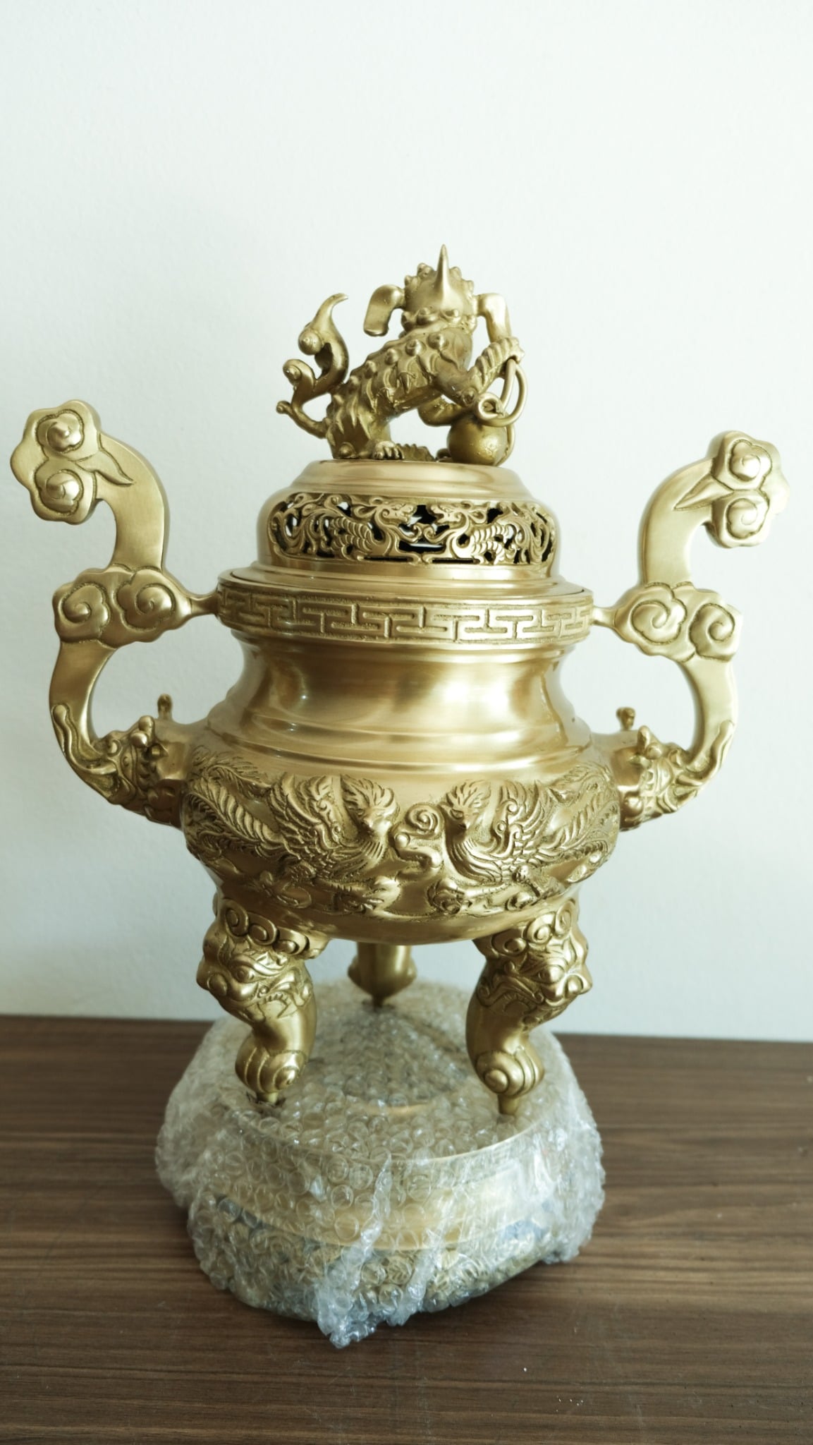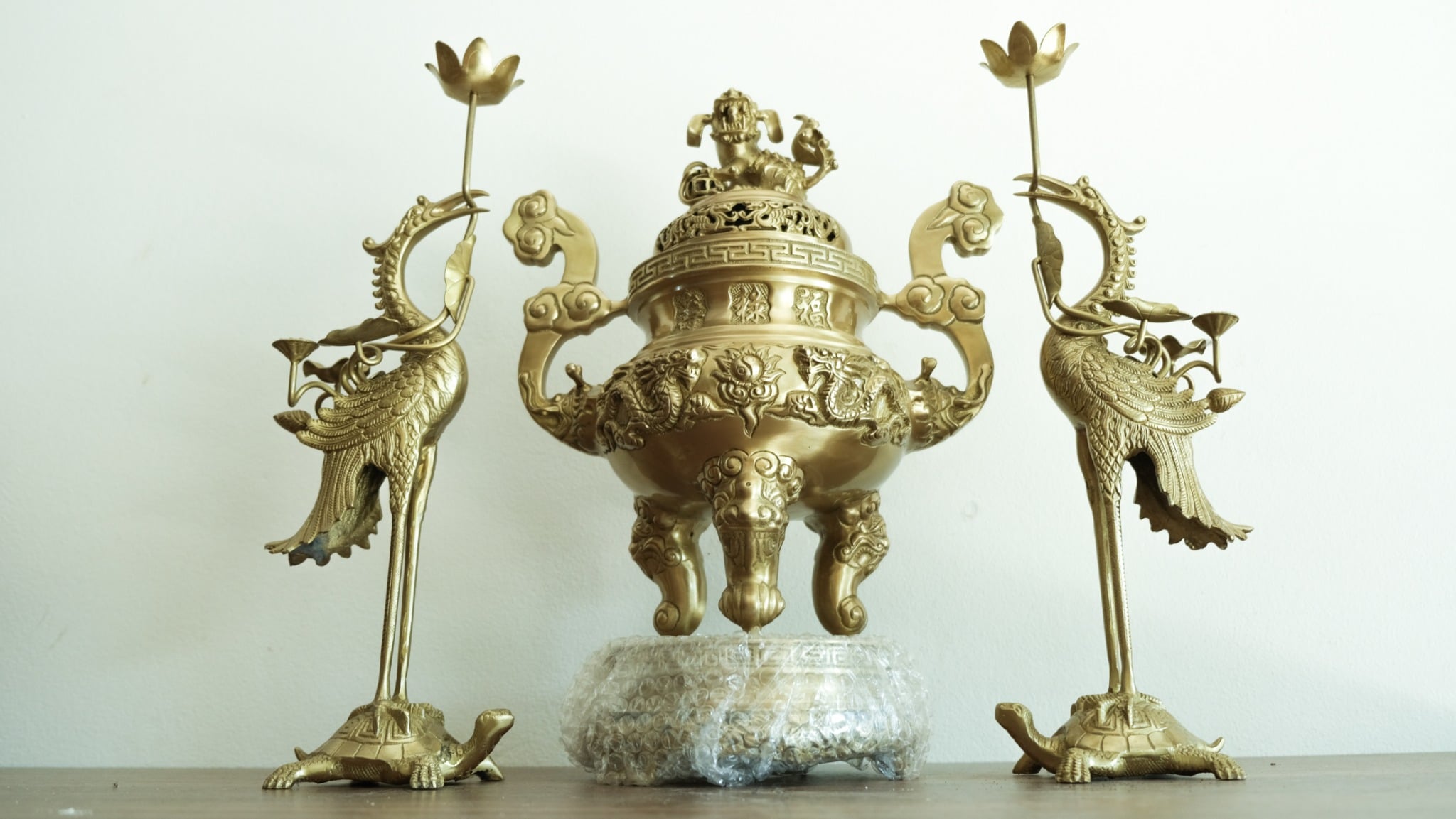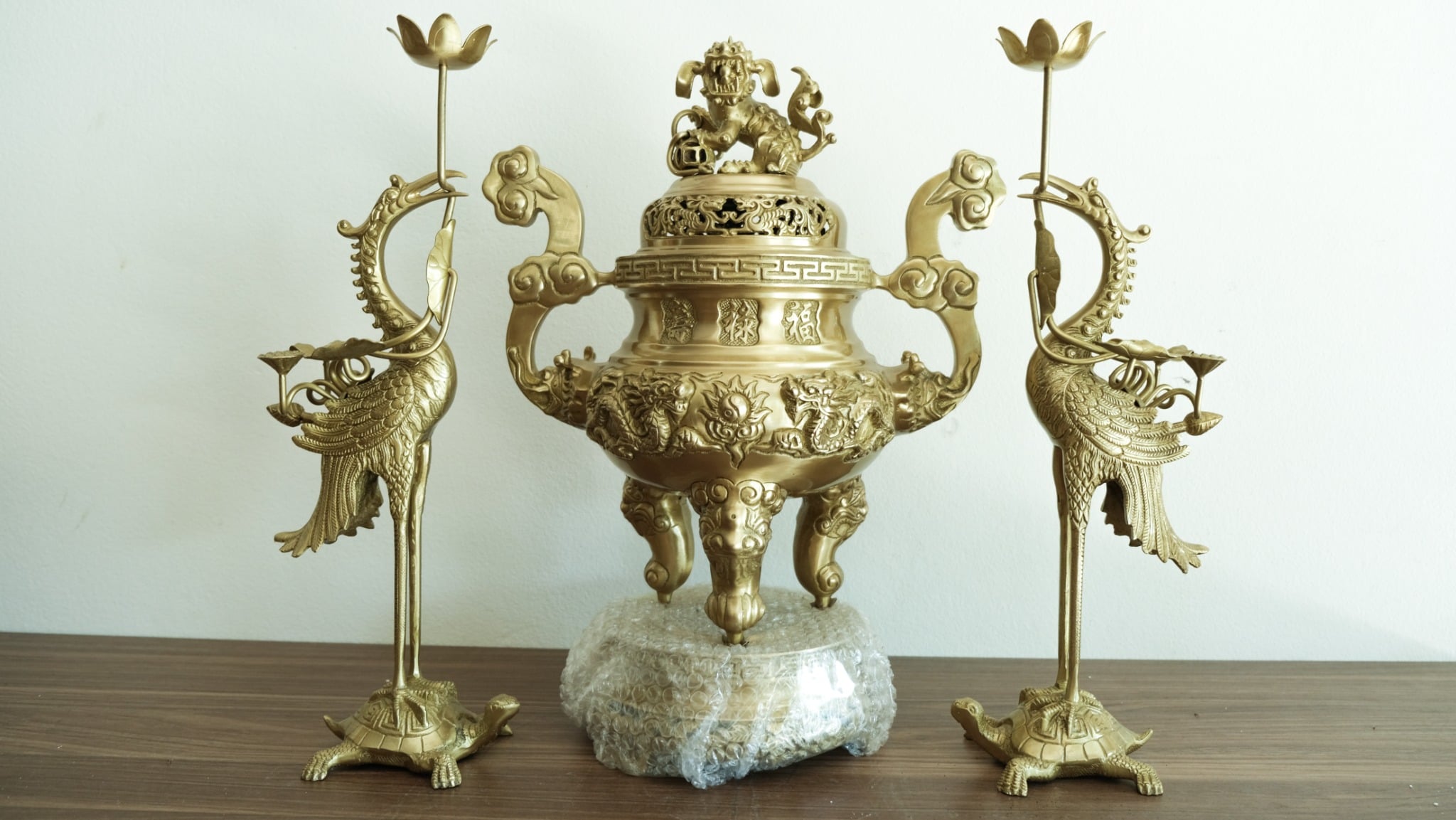 + Đối với bàn thờ dài 2m07, rộng 1m07cm, cao 1m27: Nên chọn bộ đỉnh đồng cao khoảng 70cm.