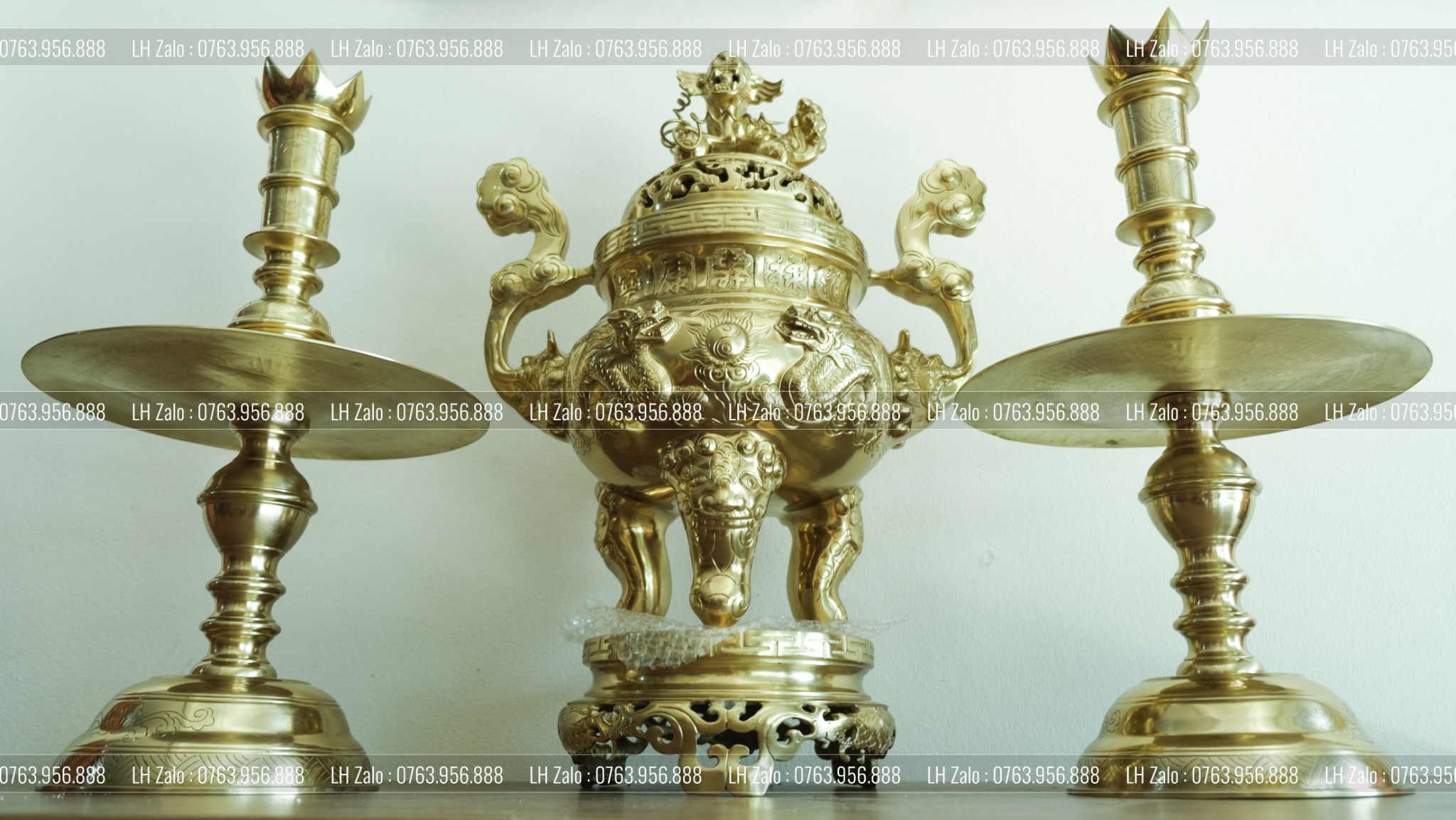 + Đối với bàn thờ dài 2m07, rộng 1m07cm, cao 1m27: Nên chọn bộ đỉnh đồng cao khoảng 70cm.