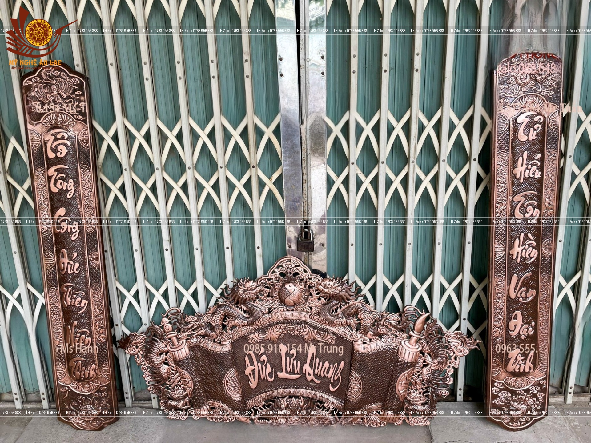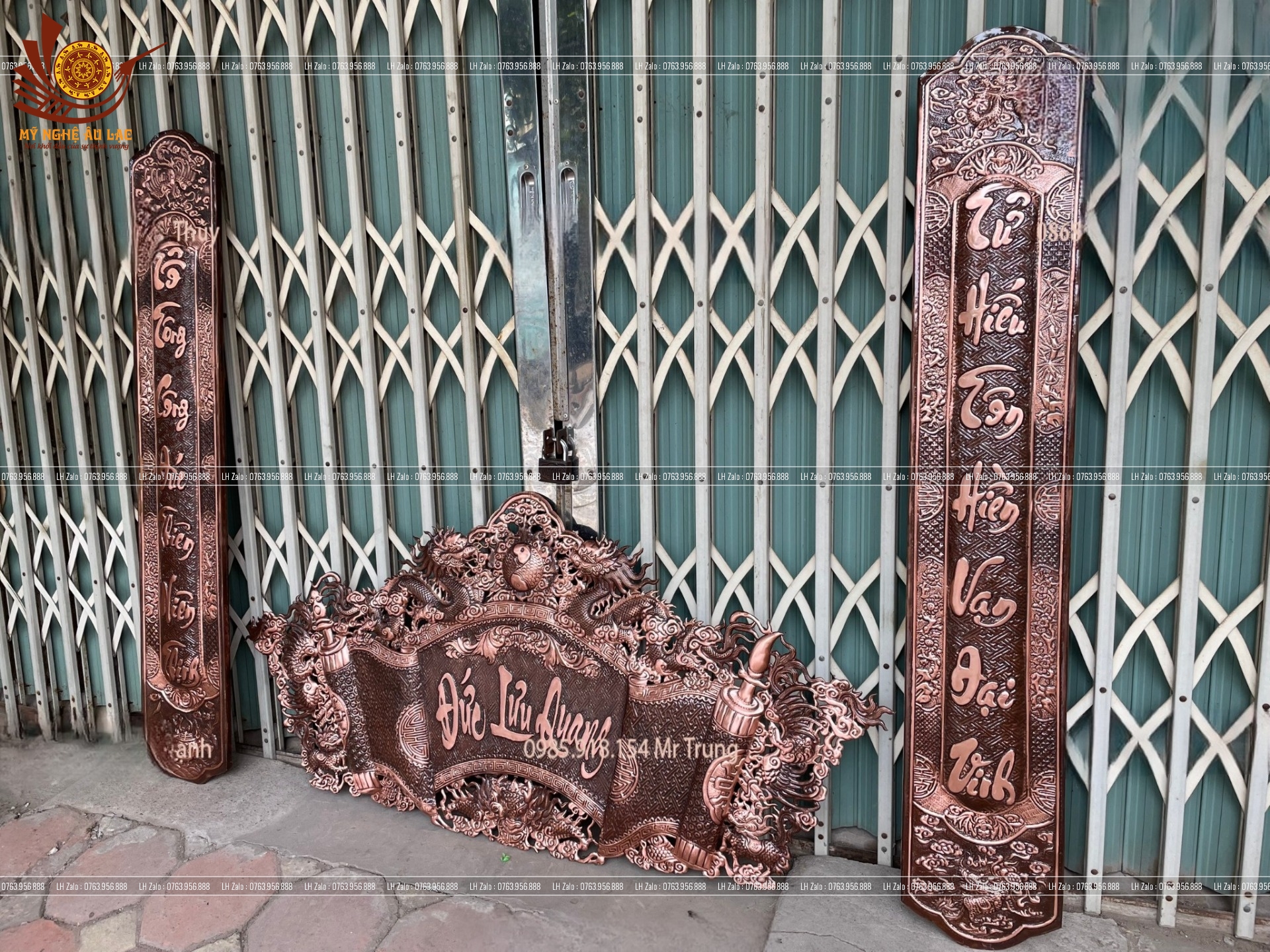| Quy cách | - Cuốn thư ngang 155cm, cao 80cm - Câu đối thẳng cao 155cm, ngang 21cm - Câu đối ôm cột cao 155cm, đường kính 24.5cm - Chế tác thủ công |