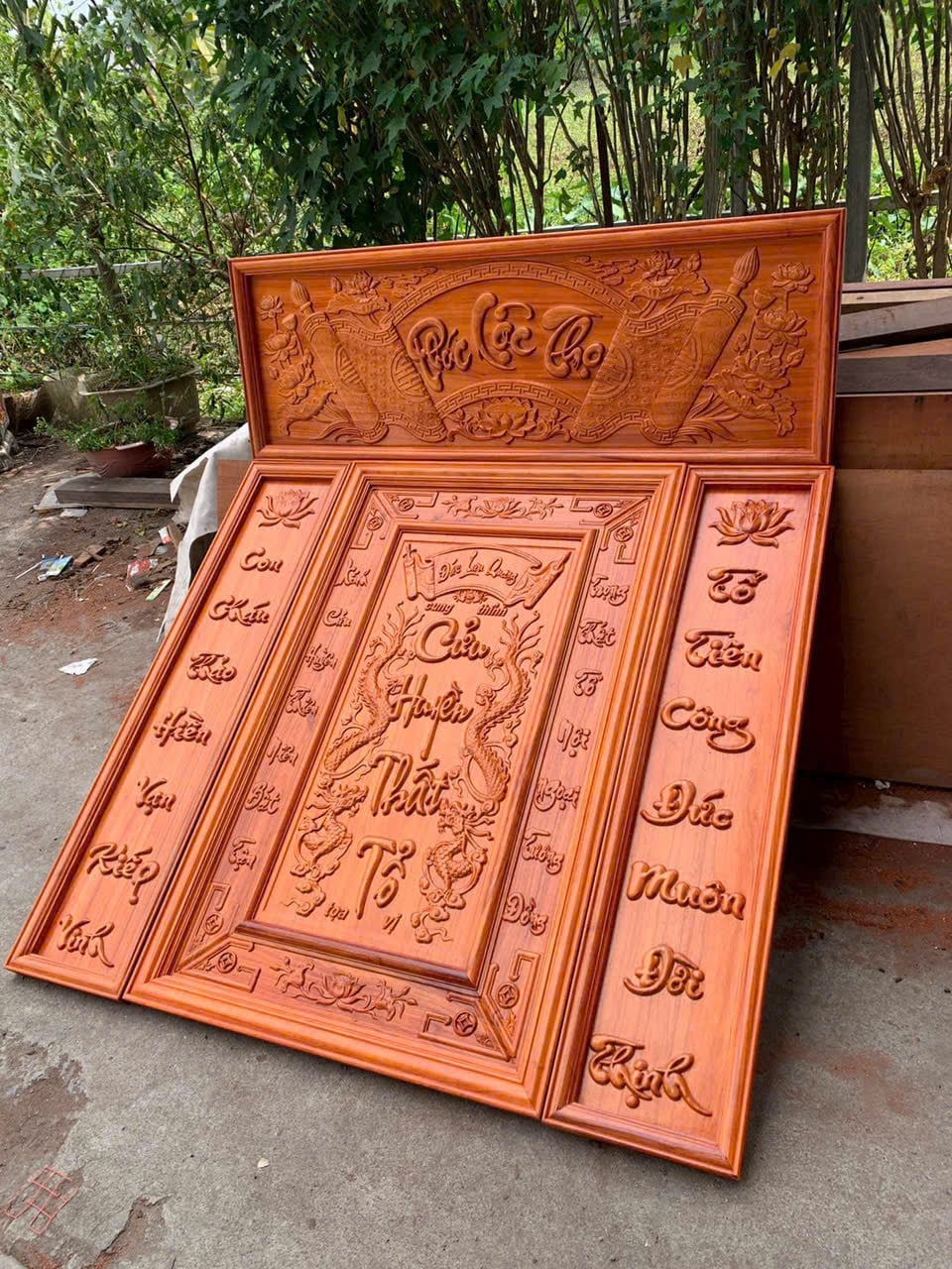 | Quy cách | - Bộ tranh cửu huyền được làm bằng gỗ hương đỏ nam phi - Hàng đục máy, sửa tay. - Tranh được dát vàng lá 18k, và được phun phủ bóng công nghệ mới nhất O7. |