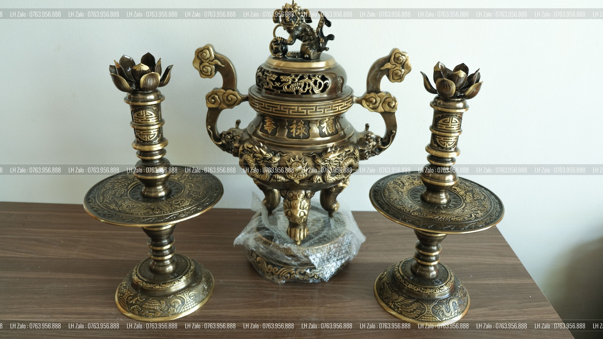 + Đối với bàn thờ dài 2m07, rộng 1m07cm, cao 1m27: Nên chọn bộ đỉnh đồng cao khoảng 70cm.