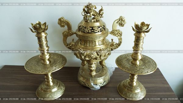+ Đối với bàn thờ dài 2m07, rộng 1m07cm, cao 1m27: Nên chọn bộ đỉnh đồng cao khoảng 70cm.
