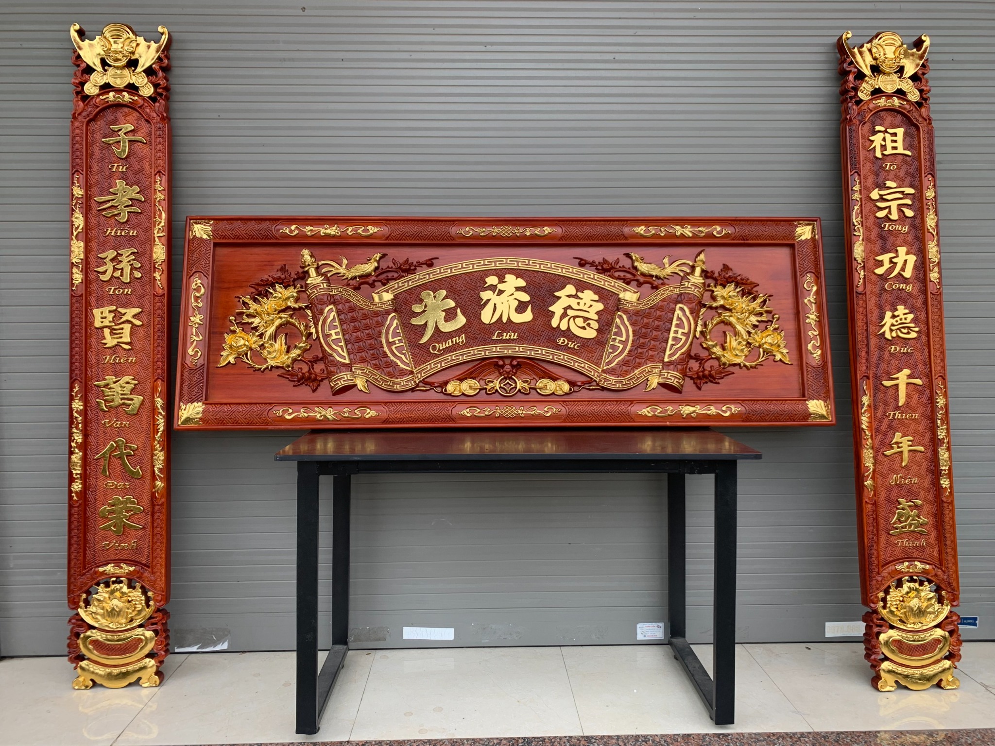 | Quy cách | - Hoành Phi KT Dài 175cm và cao 67 cm - Câu đối KT cao 175cm và ngang 28cm Liền Khối - Được đục máy sửa tay hoành phi - Gỗ chuẩn, không cong vênh, loại bỏ rác gỗ, không mắt gỗ.... - Bảo hành 10 năm |