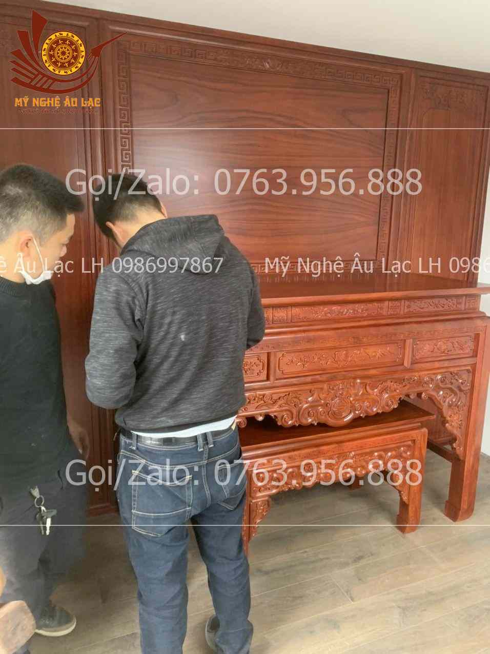 | Quy cách | - Bàn thờ đục chạm hoa sen tinh xảo, đục họa tiết hoa sen , sang trọng. - Ngang ngang 197cm, cao 117cm, sâu 87cm - Chân 12, vai 6, dạ , ván 1.2cm - Đục chạm bởi những nghệ nhân lâu năm của làng nghề. |