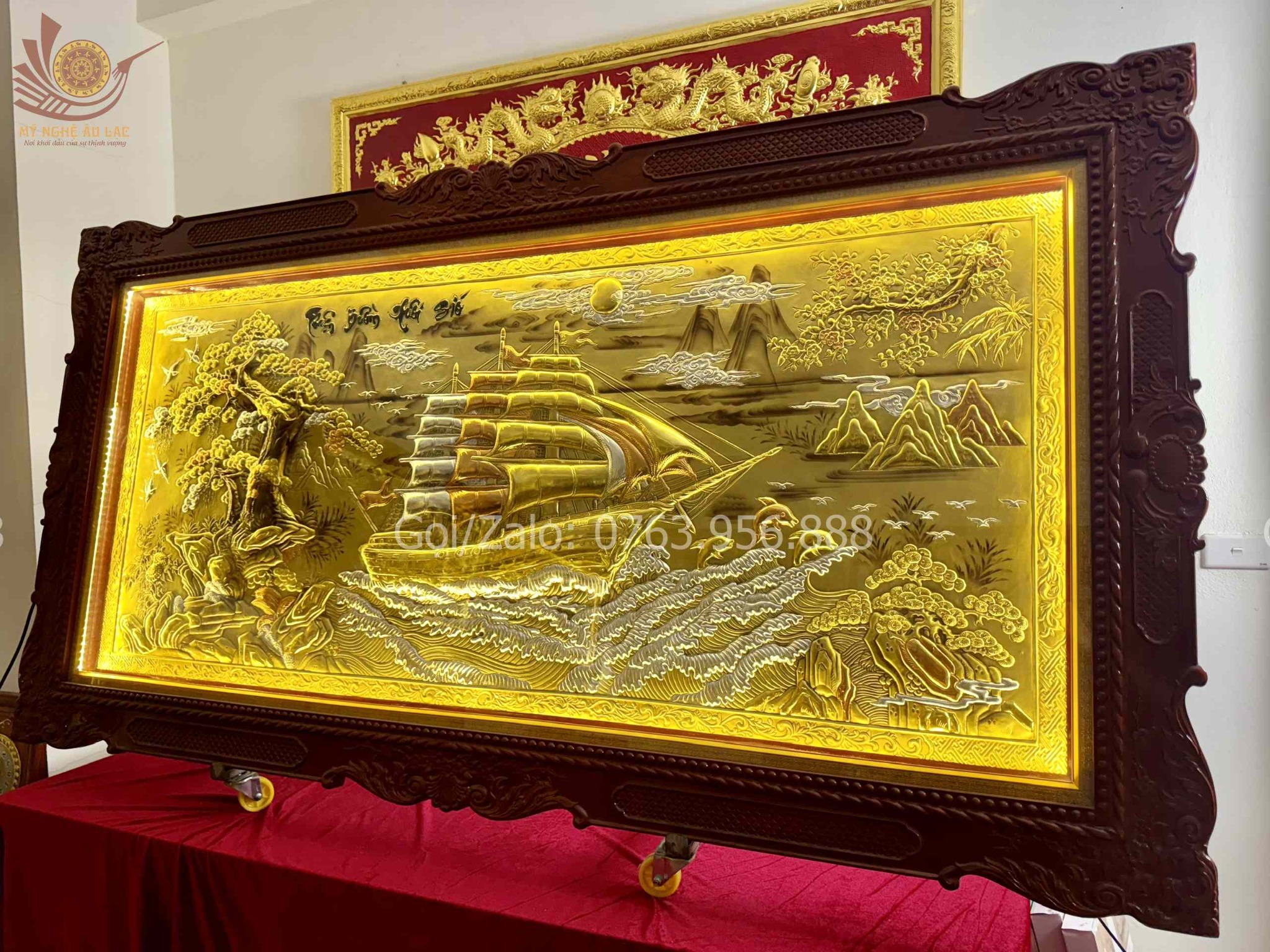 | Quy cách | - Khung tranh được làm bằng gỗ chắc chắn - Nền tranh được làm bằng đồng vàng xước dát vàng - Hàng thúc tay thủ công, hoa văn sắc nét, mềm mại tạo cho bức tranh sinh động - Tranh có kính và có đèn led. |