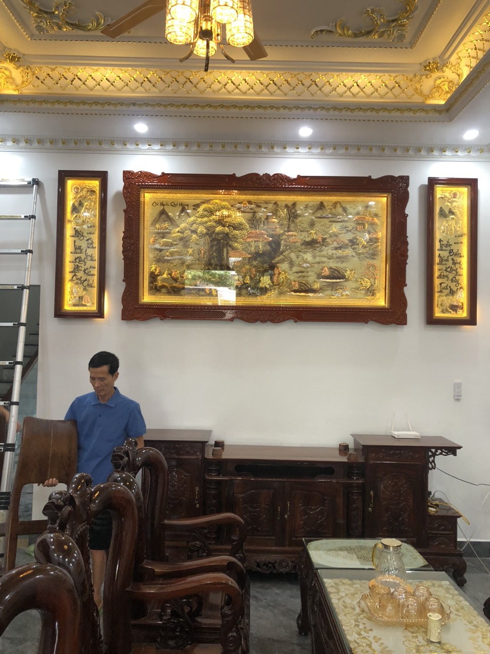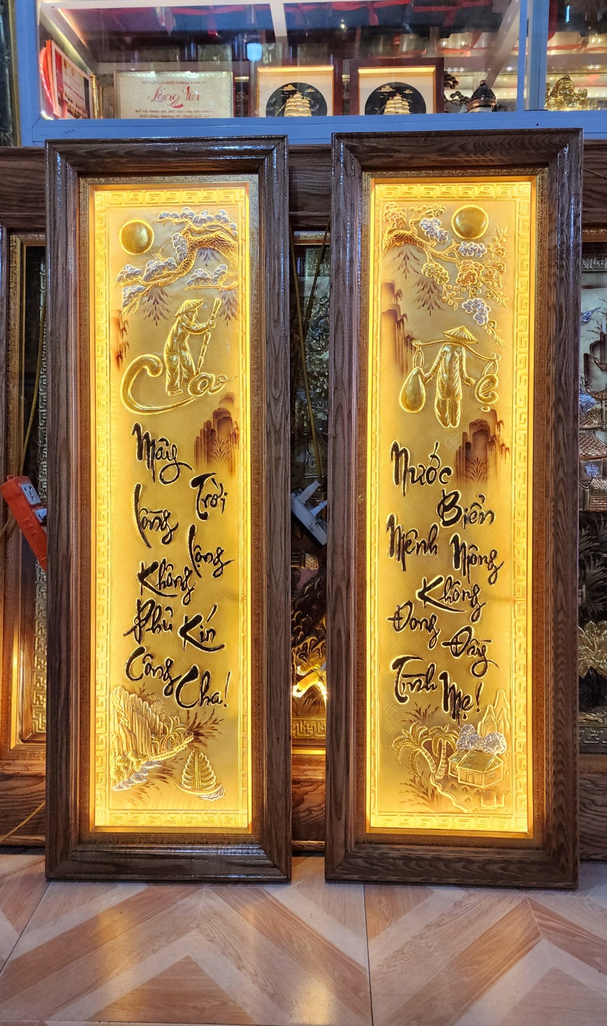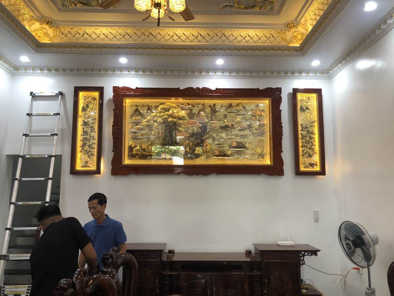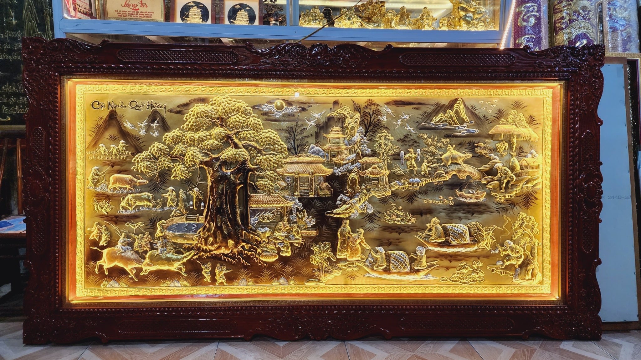 | Quy cách | - Khung tranh được làm bằng gỗ chắc chắn - Nền tranh được làm bằng đồng vàng dát vàng - Hàng thúc tay thủ công, hoa văn sắc nét, mềm mại tạo cho bức tranh sinh động - Tranh có kính và có đèn led. |
