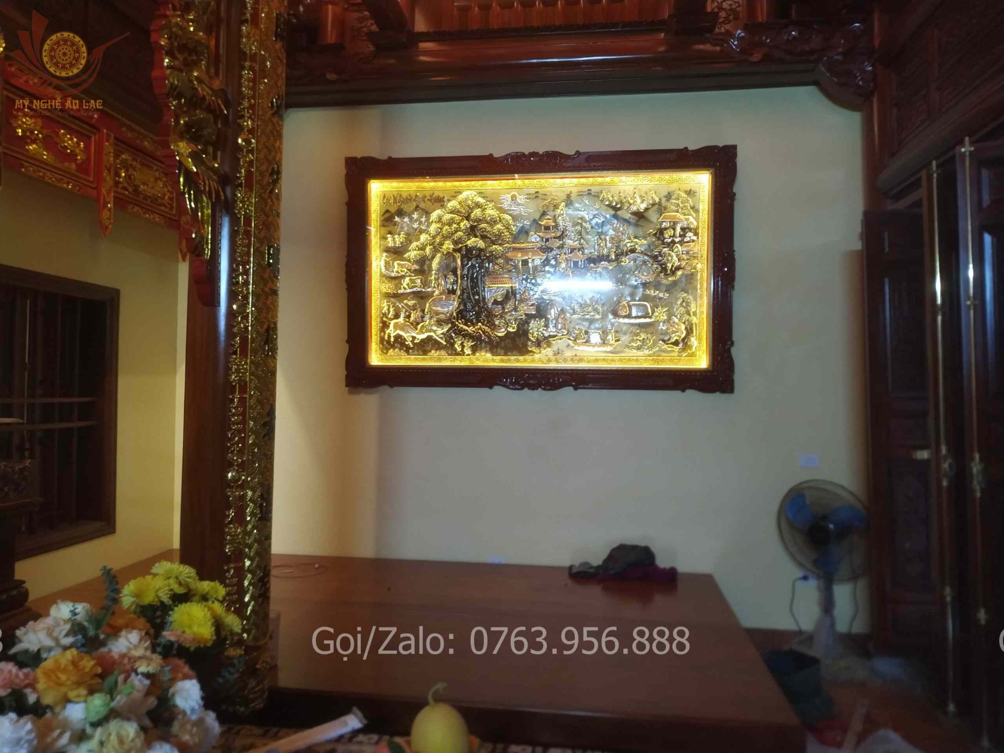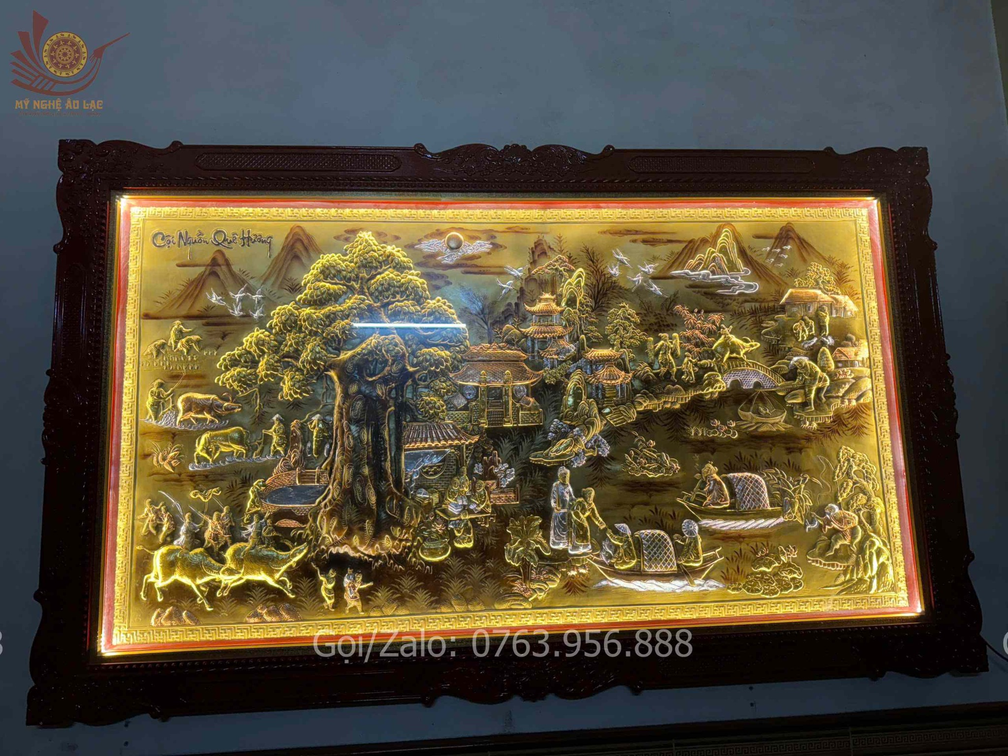 | Quy cách | - Khung tranh được làm bằng gỗ chắc chắn - Nền tranh được làm bằng đồng vàng xước dát vàng - Hàng thúc tay thủ công, hoa văn sắc nét, mềm mại tạo cho bức tranh sinh động - Tranh có kính và có đèn led. |