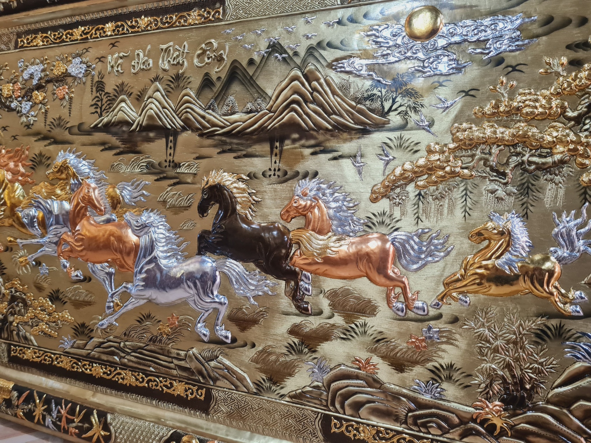 • Tranh đồng “bát mã truy phong” thường được gọi với cái tên là tranh đồng Mã Đáo Thành Công, bát tuấn đồ, bát mã toàn đồ. Nổi bật trên nền không gian mây Trời non nước của bức tranh là hình ảnh 8 chú ngựa đang phi nước đại và tiến về một hướng mang ý nghĩa biểu thị cho sức mạnh, sự đoàn kết trong một đội, thịnh vượng, thành đạt và thắng lợi.