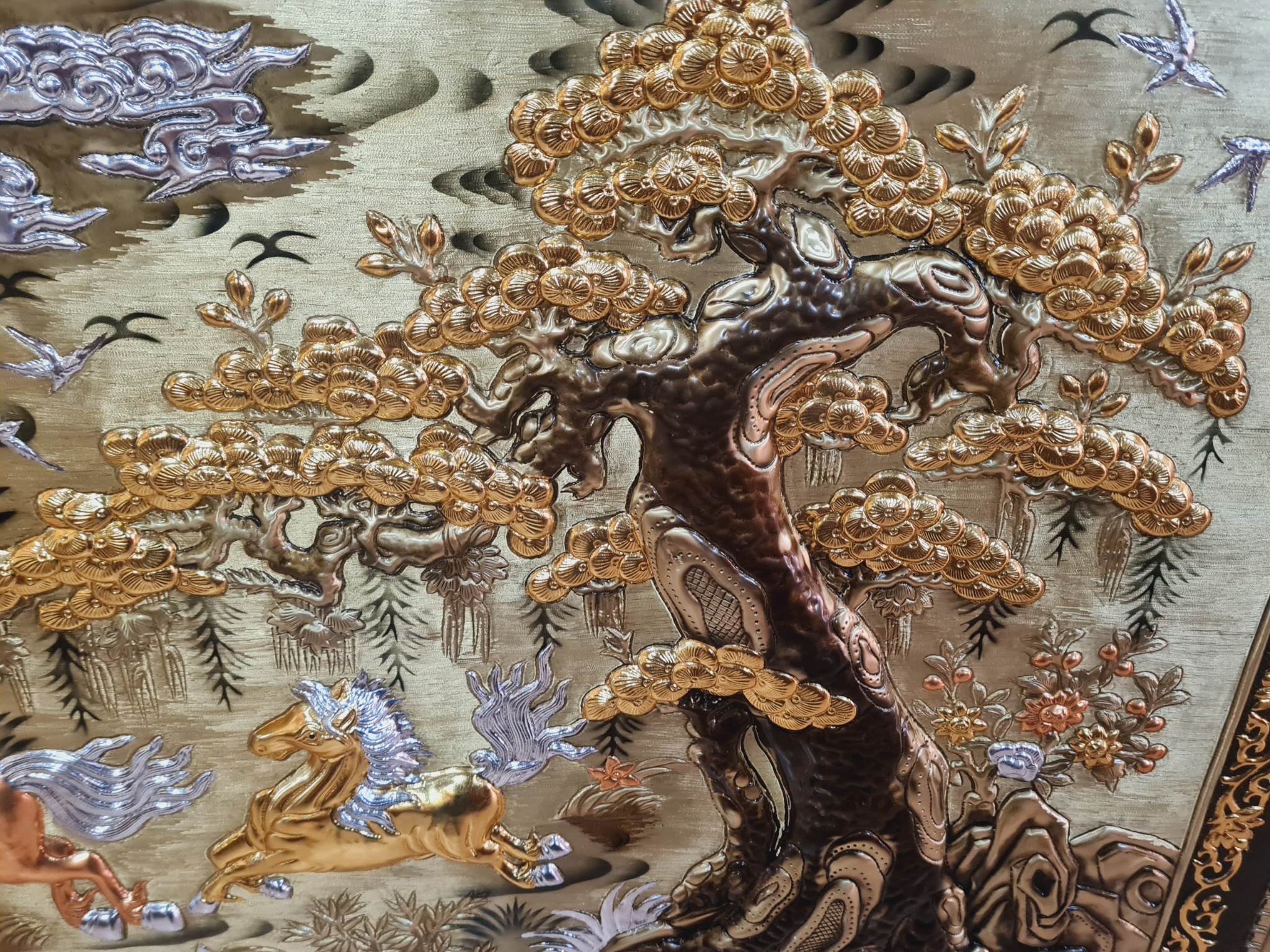 | Quy cách | - Nền tranh được làm bằng đồng vàng xước dát vàng, bạc, đồng đỏ - Hàng thúc tay thủ công, hoa văn sắc nét, mềm mại tạo cho bức tranh sinh động |