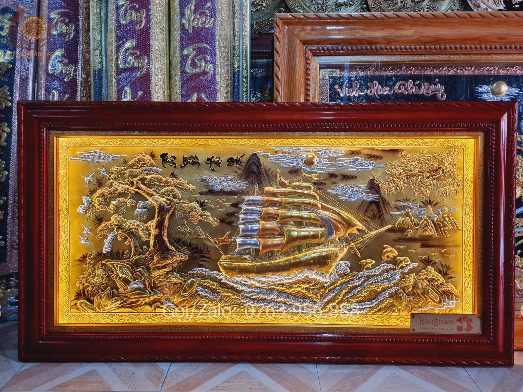 | Quy cách | - Khung tranh được làm bằng gỗ chắc chắn - Nền tranh được làm bằng đồng vàng xước dát vàng - Hàng thúc tay thủ công, hoa văn sắc nét, mềm mại tạo cho bức tranh sinh động - Tranh có kính và có đèn led. |