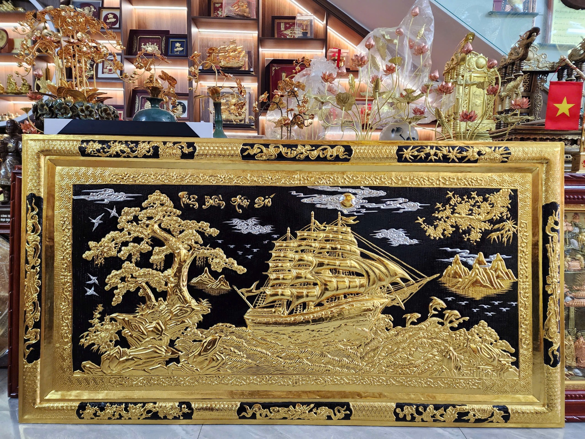 Tranh Thuận Buồm Xuôi Gió Kích Thước 170 x90 Đồng Vàng Dát Vàng Nền Đen - Khung Đồng