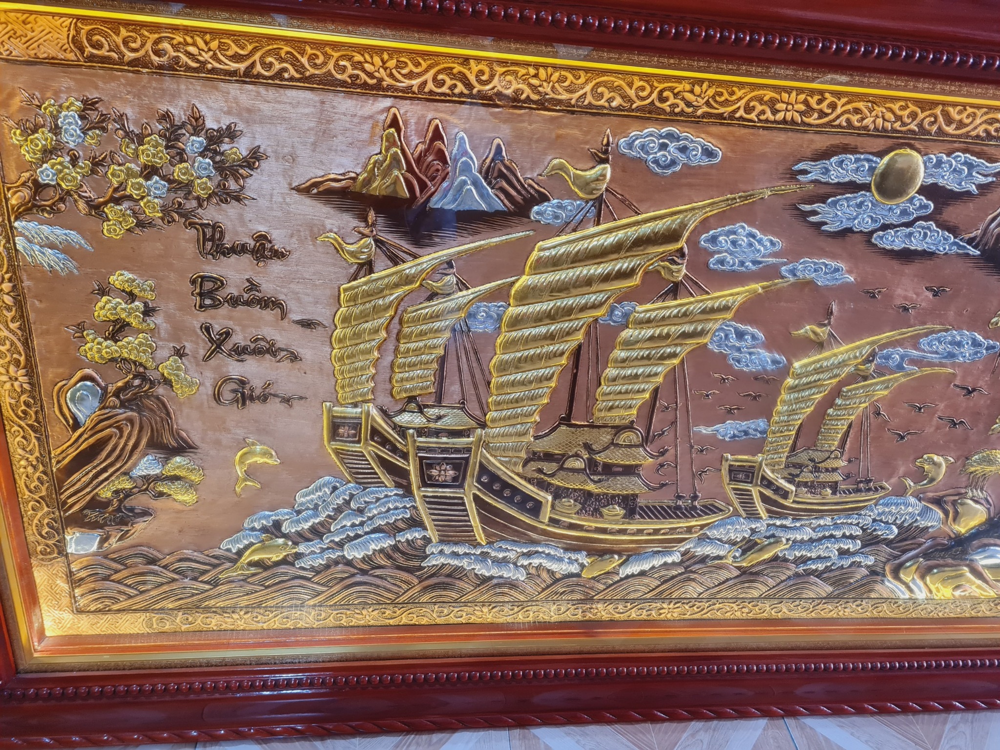 Tranh đồng Thuận Buồm Xuôi Gió với hình ảnh chiếc thuyền buồm no căng gió làm trung tâm, đứng ở vị trí chủ đạo của bức tranh. Xung quanh có thể là biển cả mênh mông hoặc khung cảnh thiên nhiên hùng vĩ kết hợp vô cùng đẹp. Tranh được giới làm ăn buôn bán, kinh doanh vô cùng ưa chuộng. Không chỉ vậy, các gia đình Việt mong muốn cuộc sống xuôi chèo mát mái đều treo một bức tranh đồng Thuận Buồm Xuôi Gió trong phòng khách, phòng làm việc.