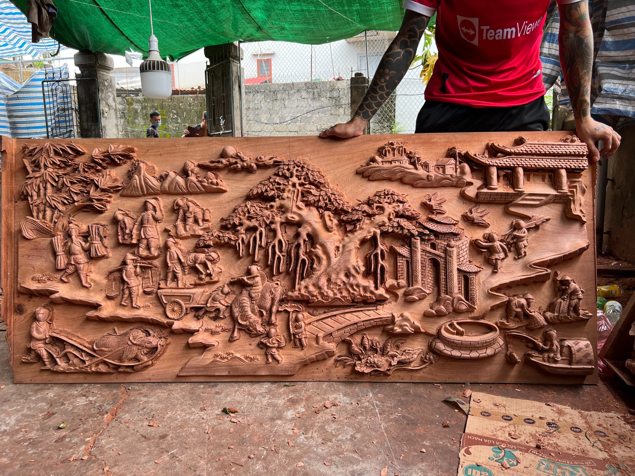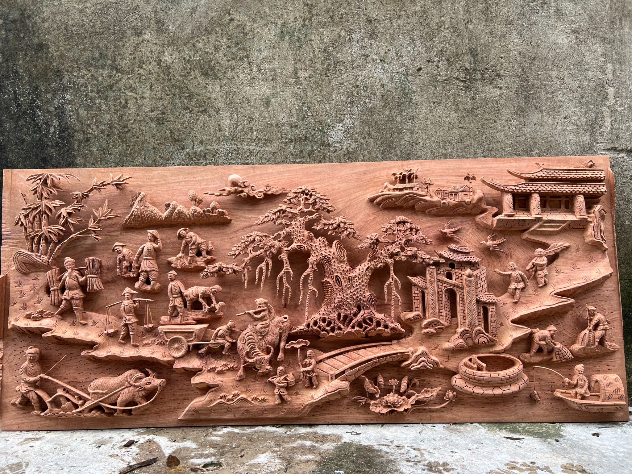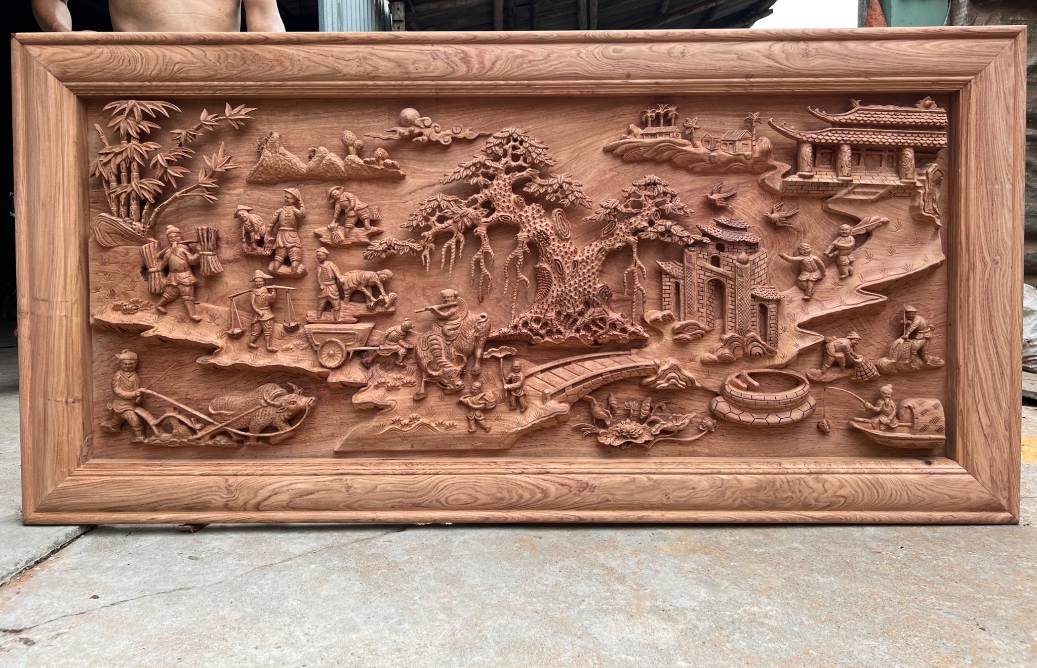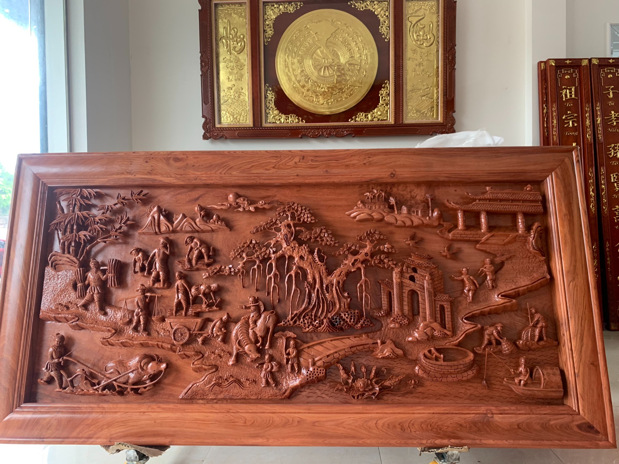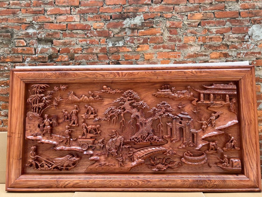 | Quy cách | - Tranh được đục, sửa tay sắc nét từ đôi bàn tay nghệ nhân nổi tiếng của Làng Nghề. - Ván bên trong nguyên tấm, khung ghép. - Gỗ chuẩn, không rác, không sâu, không mắt gỗ, gỗ khô, không cong vênh - Gỗ hương đá siêu vân đẹp |