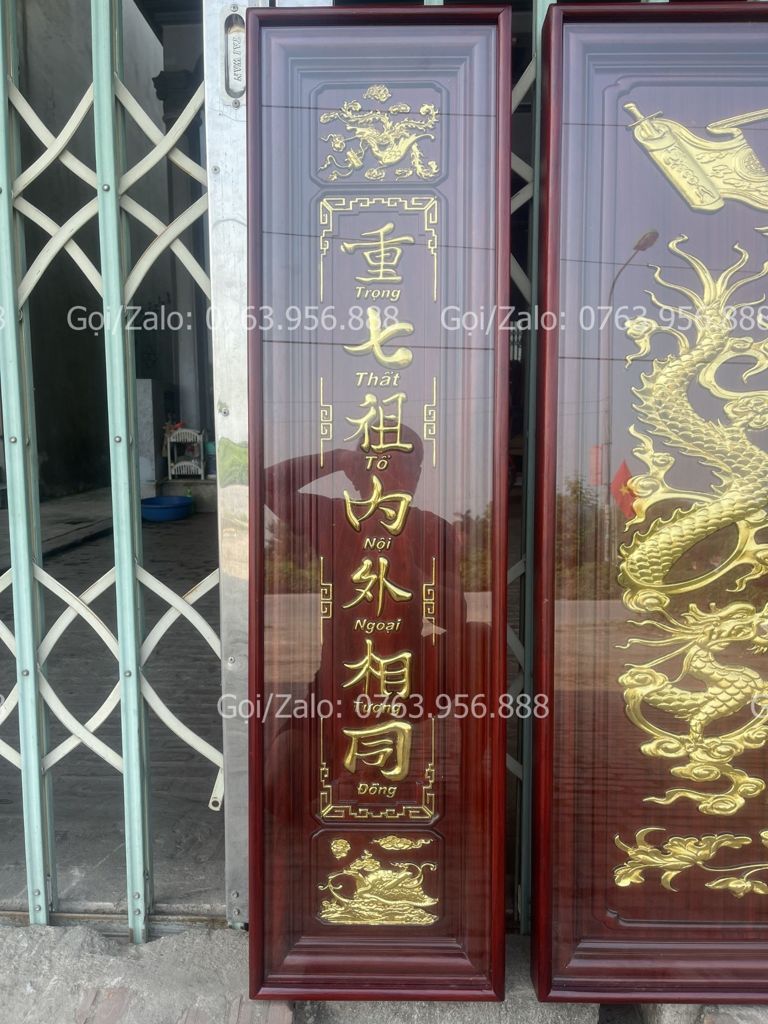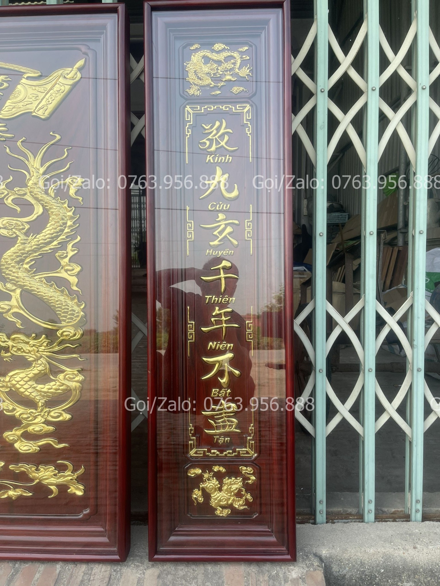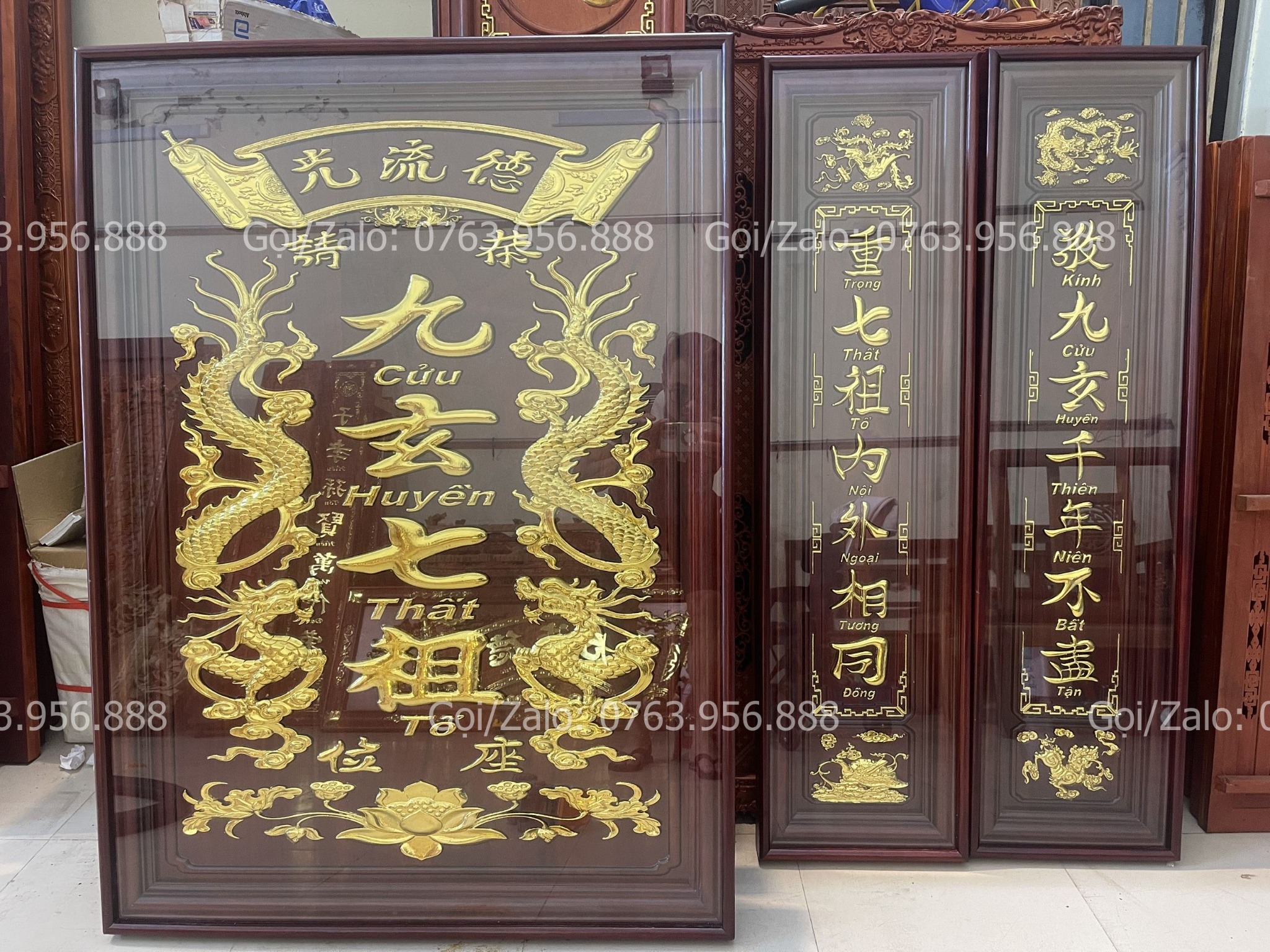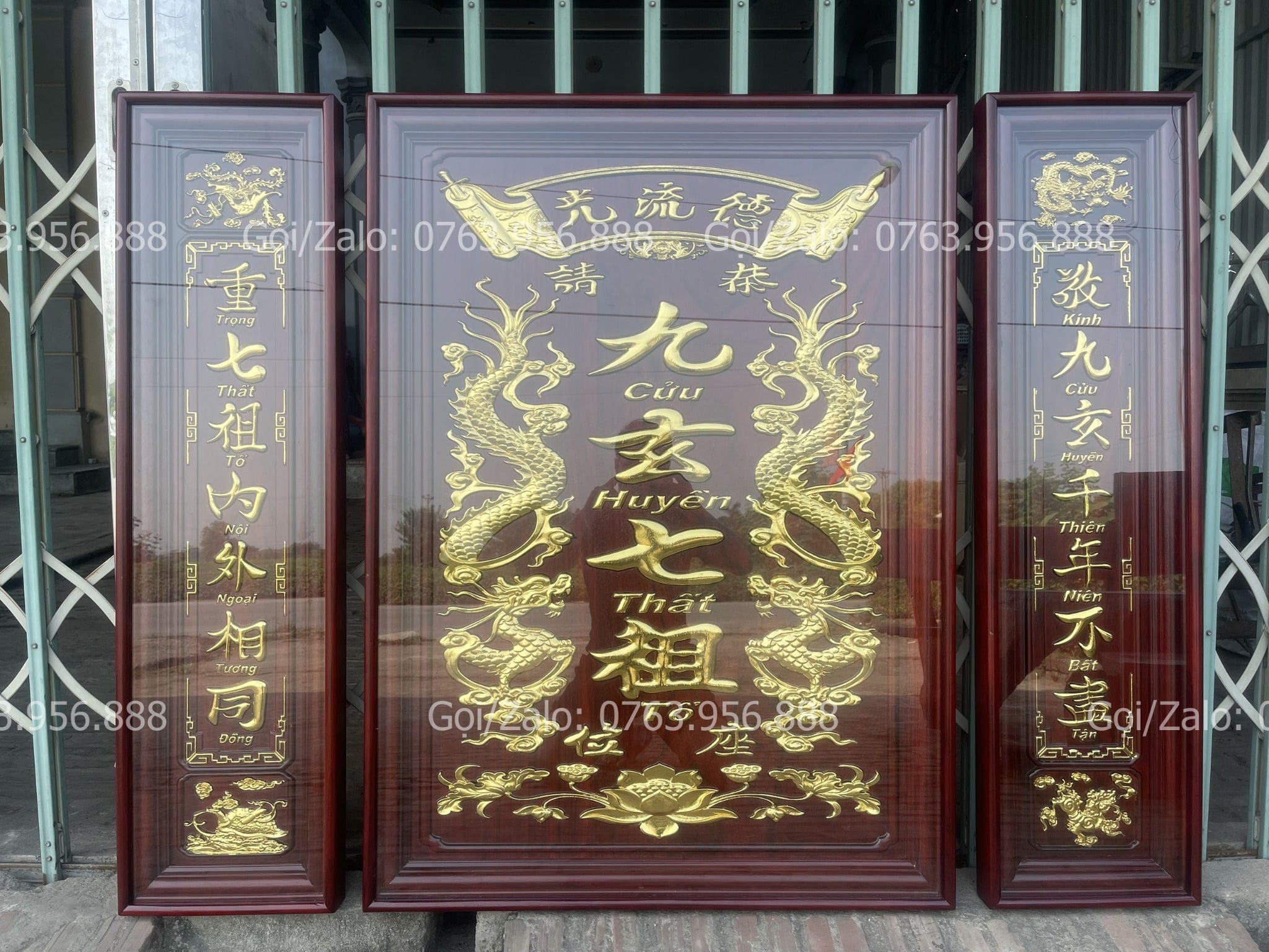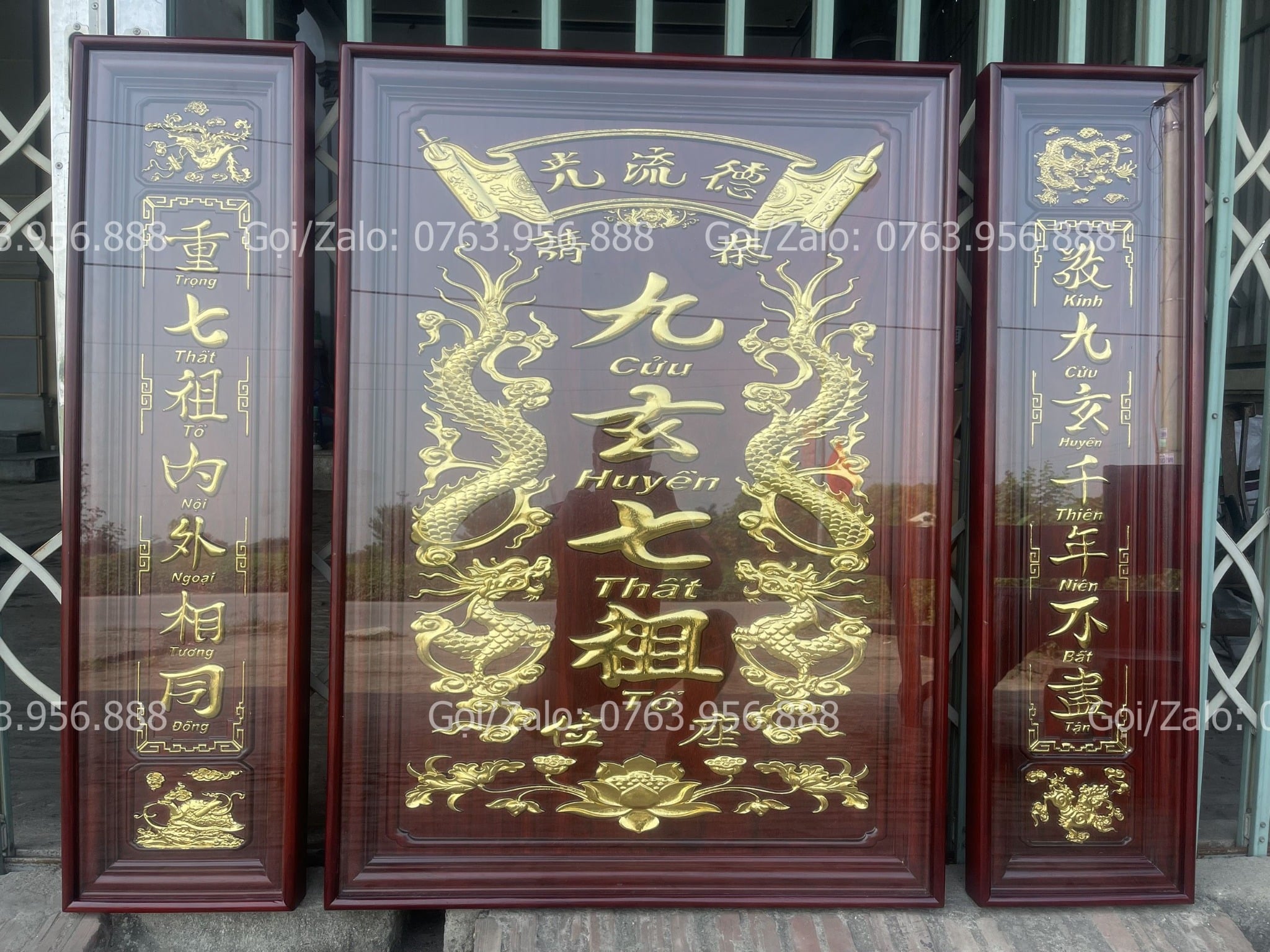 | Quy cách | - Bộ tranh cửu huyền được làm bằng gỗ hương đỏ Nam Phi - Hàng đục máy, sửa tay. - Tranh được dát vàng lá 18k, và được phun phủ bóng công nghệ mới nhất O7. |