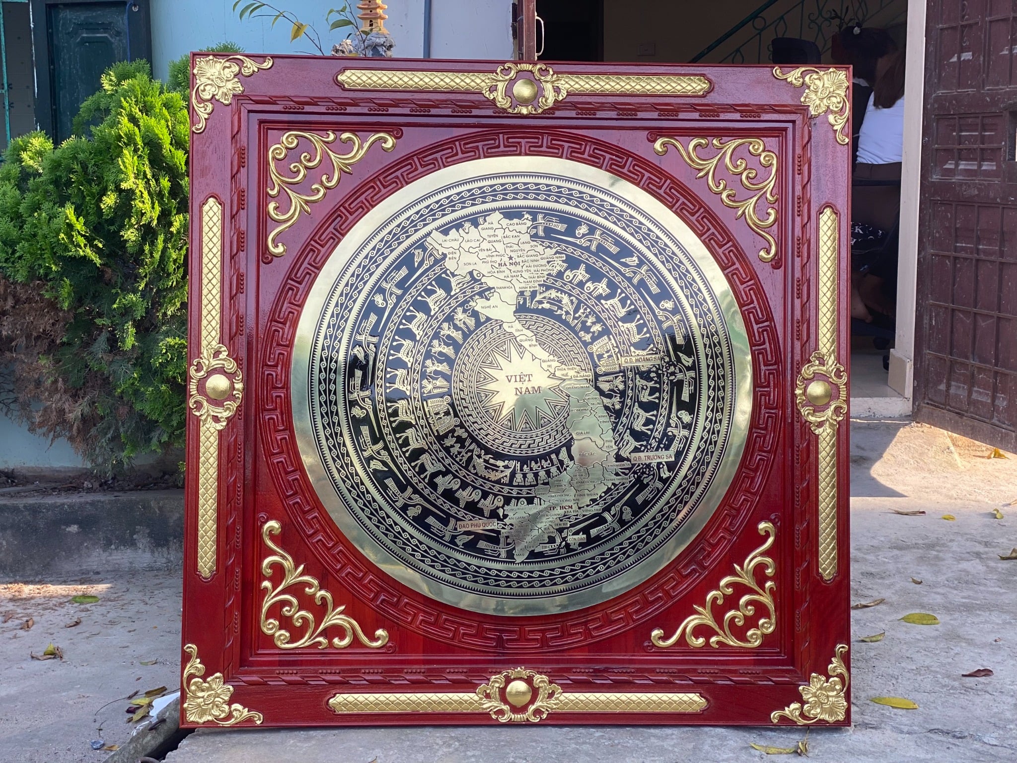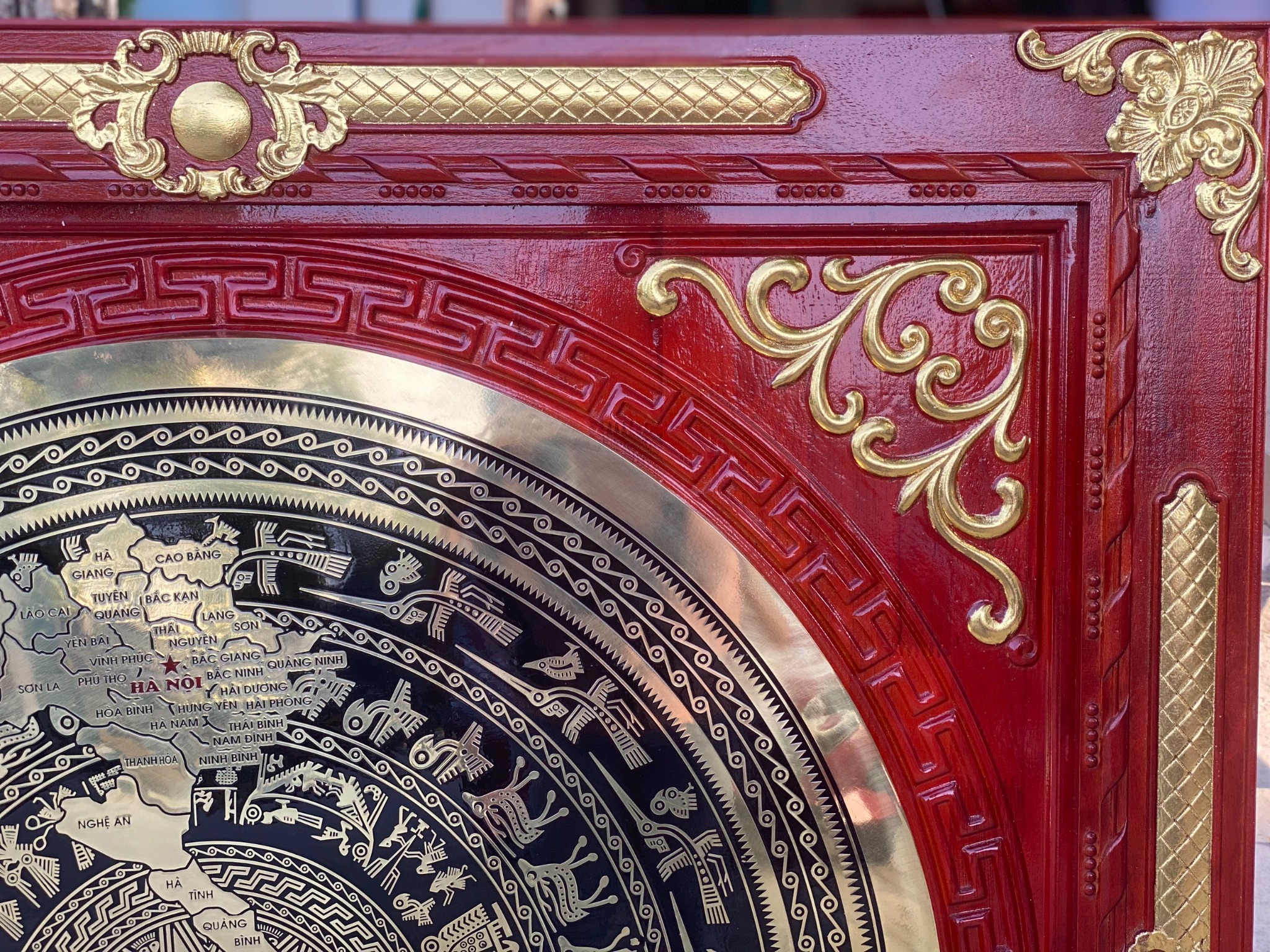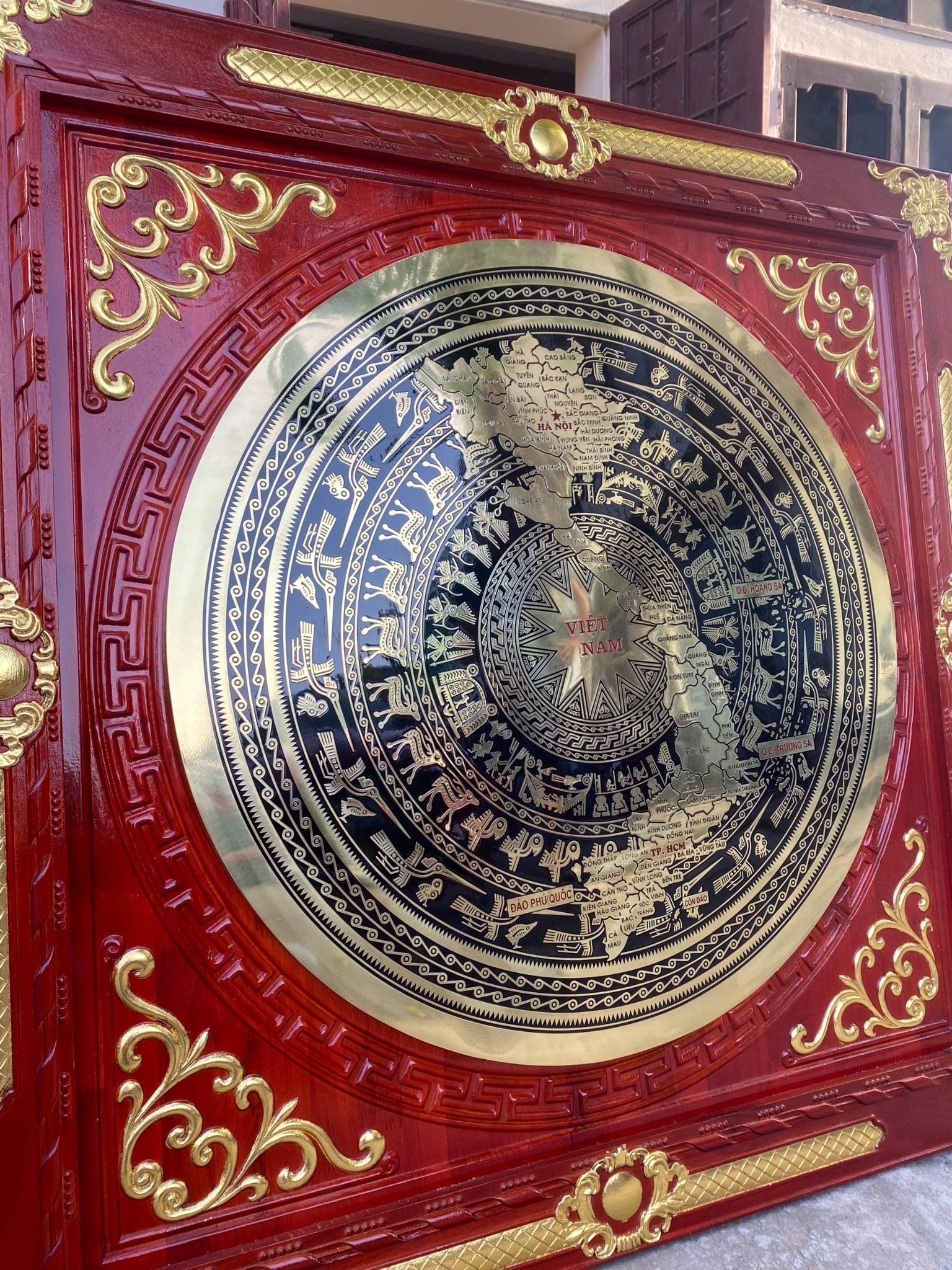 | Quy cách | - Khung gỗ được được làm bằng gỗ sồi nga đục sắc nét Gỗ chuẩn, không cong vênh, không mối mọt, không mắt gỗ. KT phủ bì khung gỗ: 140*140 cm - Khung gỗ dát vàng. gỗ ép công nghiệp cao cấp. Đục hoa văn CNC - Mặt trống bằng đồng vàng CNC. Mặt trống đường kính 100cm |