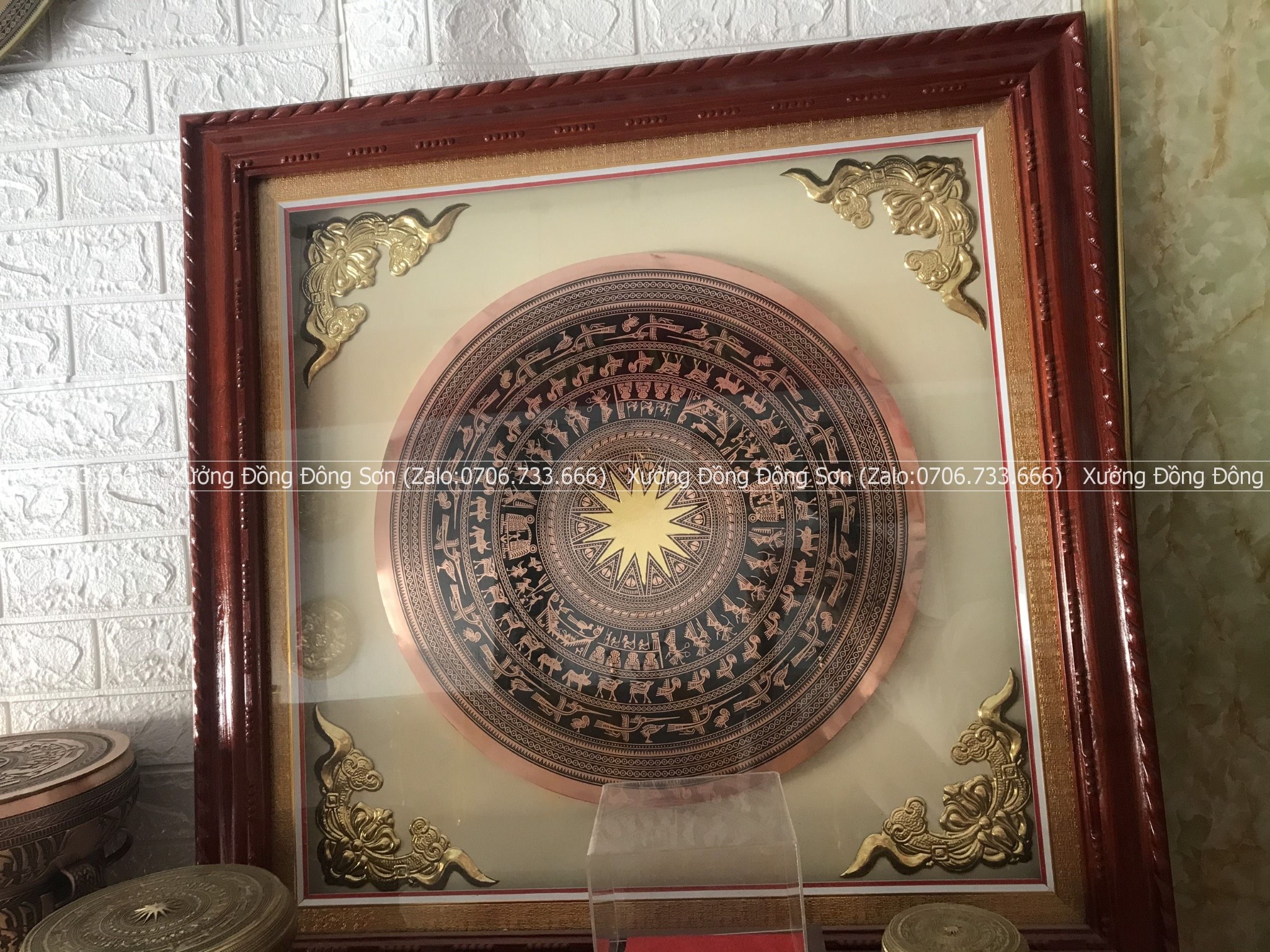 | Quy cách | - Khung tranh bằng gỗ Sồi Nga, có kính và đèn led - Mặt trống đường kính 60cm |