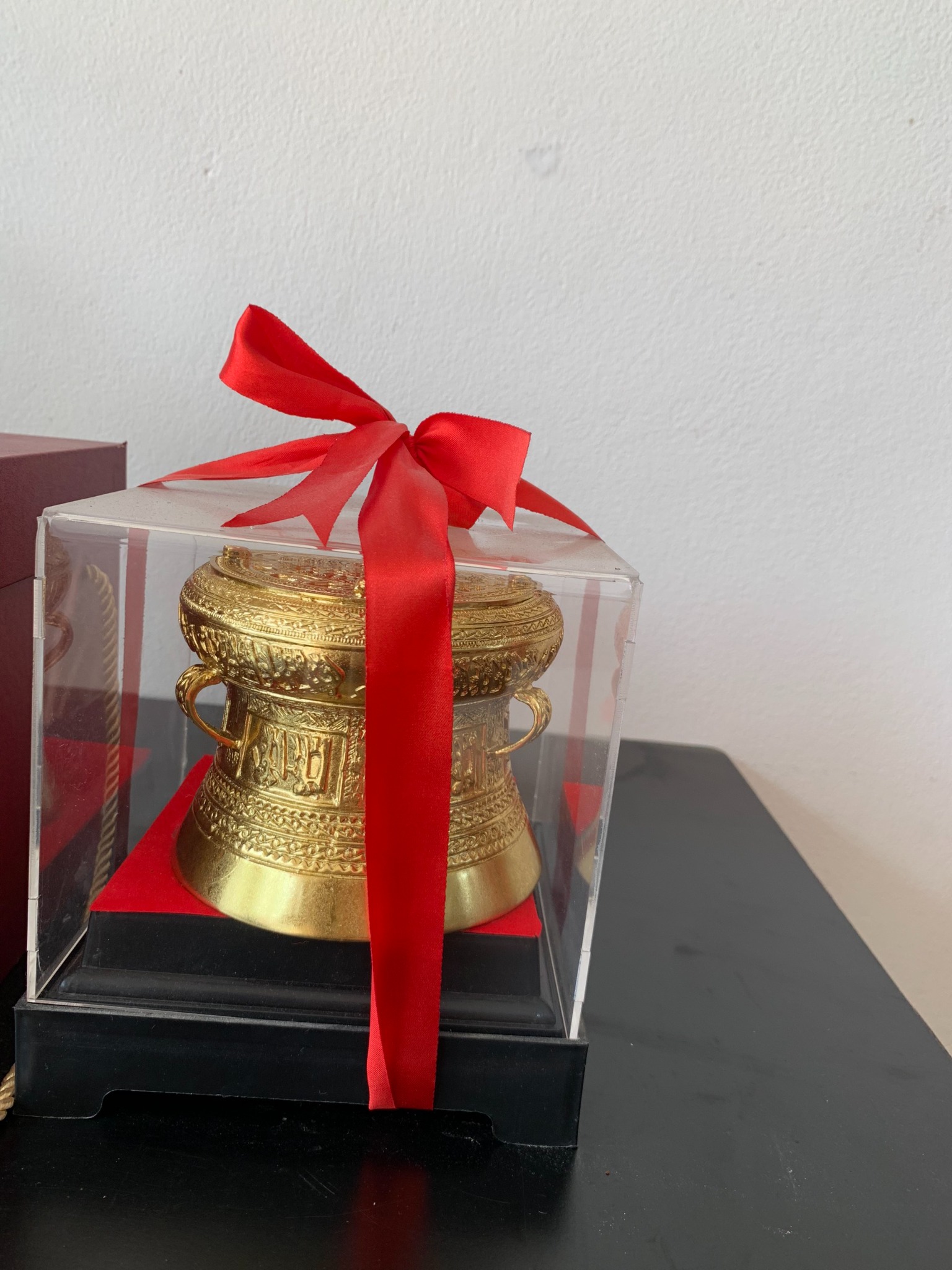| Quy cách | - Trống đồng được đúc hoàn toàn thủ công - Tất cả các công đoạn làm đều được những nghệ nhân lâu năm của làng nghề tạo nên - Dát vàng 18k toàn bộ trống |