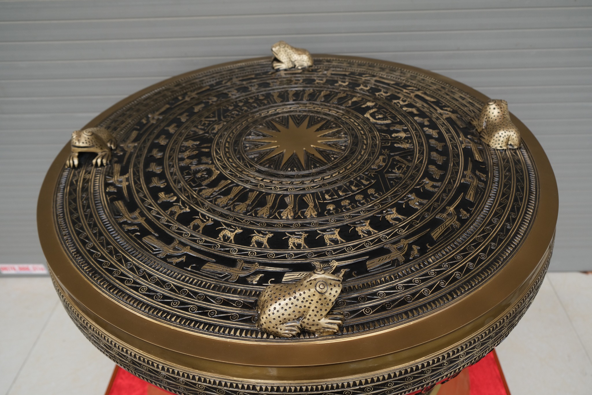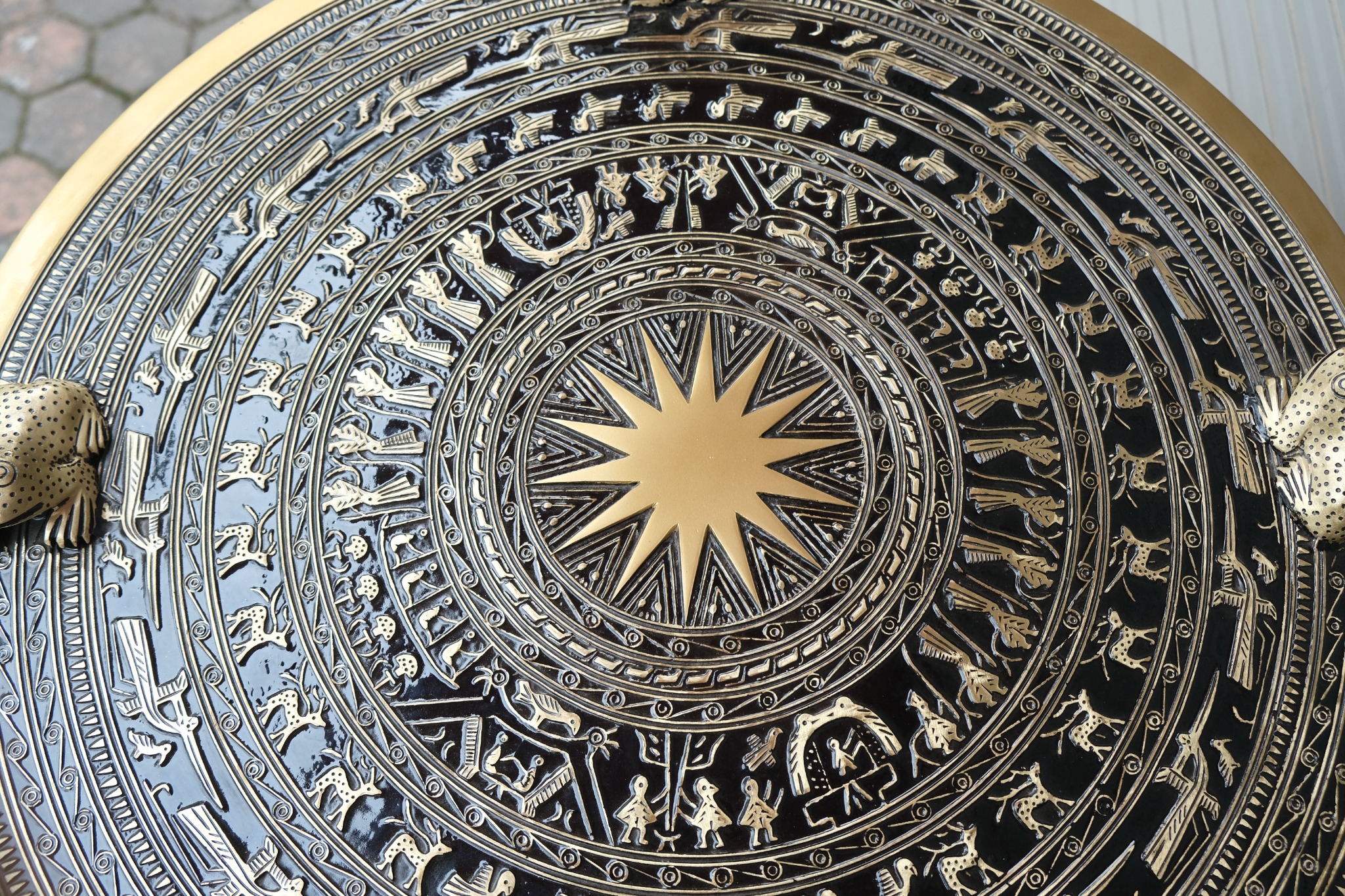 • Trên mắt trống đồng Đông Sơn là hình ảnh ngôi sao 14 cánh tượng trưng cho mặt trời, khoảng cách giữa các cánh sao là hoạ tiết hình lông công, tiếp đến là 16 vòng hoa văn trang trí với nhiều hình vẽ khác nhau. Vòng 1,5 và 11 là các chấm nhỏ, các vòng 2, 4, 7, 9, 13 và 14 là chấm tròn và có tiếp giáp, còn lại vòng 12 và 16 là hình răng cưa, vòng 6, 8 và 10 là hoa văn hình người hoặc động vật diễu hành xung quanh ngôi sao và ngược chiều kim đồng hồ.